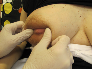 Brodawki mogą mieć różne kształty i wielkość, niekiedy są krótkie, płaskie lub wręcz wklęsłe. Taki kształt mogą mieć obie brodawki lub tylko jedna. W przypadku brodawek o nietypowych kształtach należy ocenić kilka podstawowych cech, które mogą ułatwiać dziecku uchwycenie piersi: wysuwalność brodawek wklęsłych, stawianie się płaskich pod wpływem stymulacji oraz elastyczność brodawki i otoczki. Jeżeli brodawka uchwycona palcami u podstawy daje się wysunąć, brodawka płaska stawia się, są one rozciągliwe, to karmienie tą piersią nie powinno stanowić problemu i nie są potrzebne dodatkowe zabiegi. (Fot. 1)