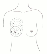 - DRENAŻ KLASYCZNY – stosowany dopiero gdy nie pomogły dwie powyższe techniki, wobec ropni wielokomorowych, mnogich. głęboko położonych. Zdrenowanie ropnia na ogół wymaga dokonania kilku cięć, zastosowania znieczulenia ogólnego i pozostawienia drenu (Eryilmaz 2005). Miejsce nacięcia skóry powinno być starannie wybrane: nad punktem największego chełbotania ropnia, powinno układać się wzdłuż kryz skórnych (ryc. 1) i nie być zbyt głębokie (niepotrzebne zbyt głębokie nacięcia zwłaszcza w okolicy otoczki mogą spowodować powstanie przetoki okołosutkowej – fistula mammillae, zmiany trudnej do leczenia). Kolejne warstwy nacina się wzdłuż przebiegu przewodów mlecznych – promieniście (ryc. 2). Jamę ropnia można następnie wypłukać roztworem środka miejscowo znieczulającego, co pozwoli na zmniejszenie bólu.